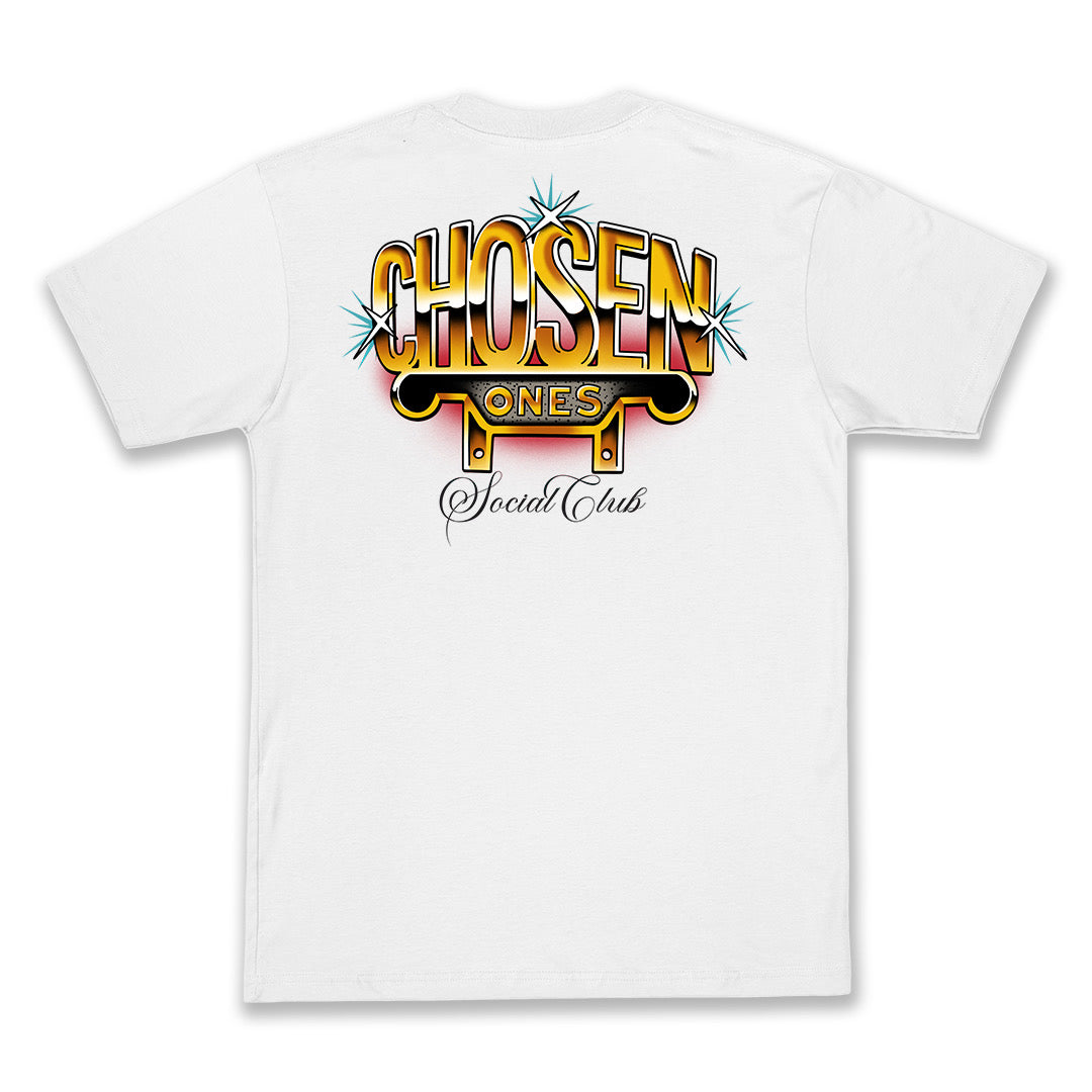 White Tee with White, Red, Gold, Blue, and Black Graphic